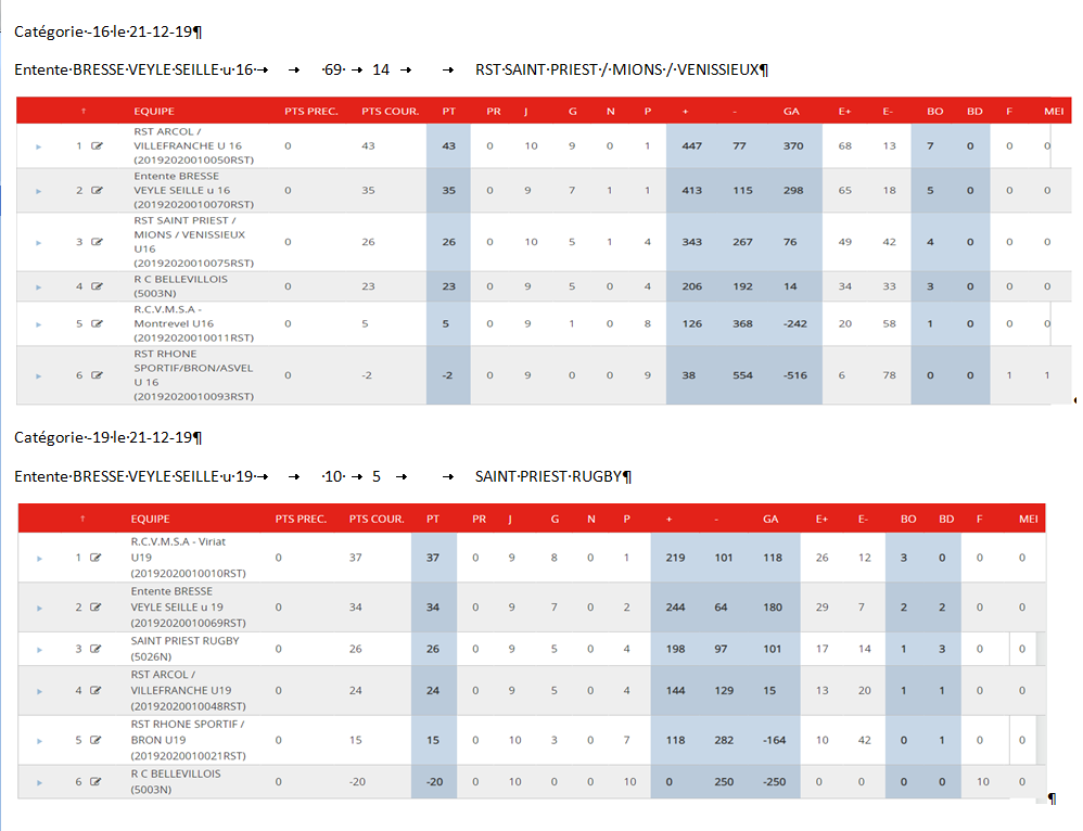 résultats U16 U19